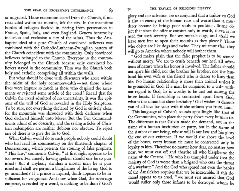 ‘But we muzzle dogs, and shall we leave men free to open their mouths as they please? Those who object are like dogs and swine. They murmur that they will go to America where nobody will bother them.’ [ref]Bainton, Roland H. The Travail of Religious Liberty – Nine Biographical Studies. Philadelphia, PA: Westminster Press, 1951.,70.[/ref]