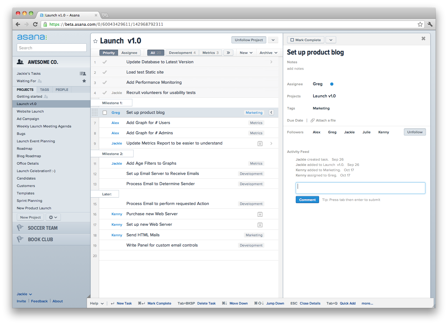 Asana is really the new kid on the block, but it’s rapidly gaining traction, and it uses a different methodology to the two apps above, being web based rather than in-app.  However, it is aimed squarely at small organisations rather than individuals, and this is where I use it regularly. At an organisational level it has the ability to encompass a wide range of tasking and meeting planning and is exceedingly useful in that capability. On the surface at an individual level it doesn’t offer much more than Things or Wunderlist, but in its delegation and project tracking it really shines. If your task management requirements tend more towards the small office or organisation, then look no further. It is also free for under 15 users in a group.